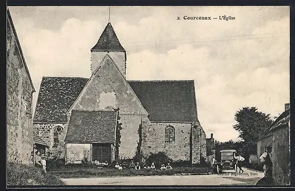 AK Courceaux, L`Église avec voiture et villageois devant l`entrée