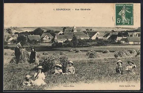 AK Courceaux, Vue Générale avec des enfants jouant dans un champ en été