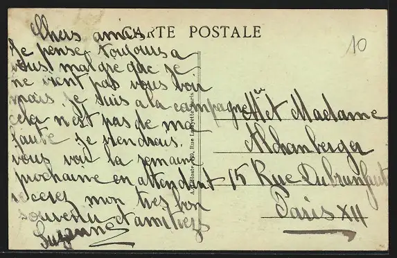 Personenbezogene Daten auf der Rückseite der Karte wurden durch blauen Textmarker unkenntlich gemacht. Die blauen Stellen sind auf die Vorderseite durchgeweicht und wirken sich negativ auf das Postkartenfoto aus