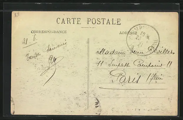 Personenbezogene Daten auf der Rückseite der Karte wurden durch blauen Textmarker unkenntlich gemacht. Die blauen Stellen sind auf die Vorderseite durchgeweicht und wirken sich negativ auf das Postkartenfoto aus