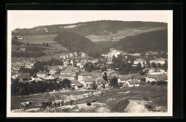 AK Couvet, Blick von einer Anhöhe auf den Ort