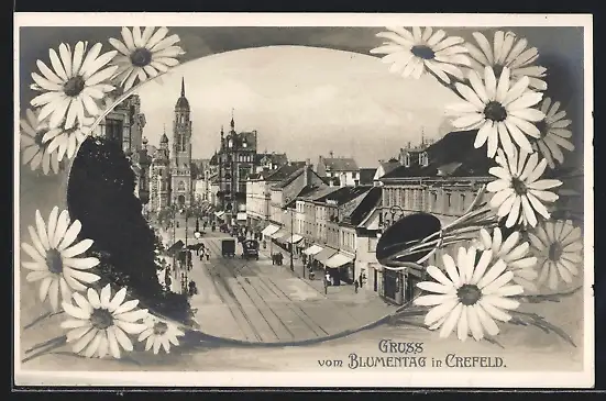 AK Crefeld, Blumentag, Strassenpartie mit Pferdekutschen