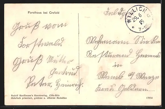 gelaufen 1915, Eckknick unten re., Einriss oben re., guter Zustand