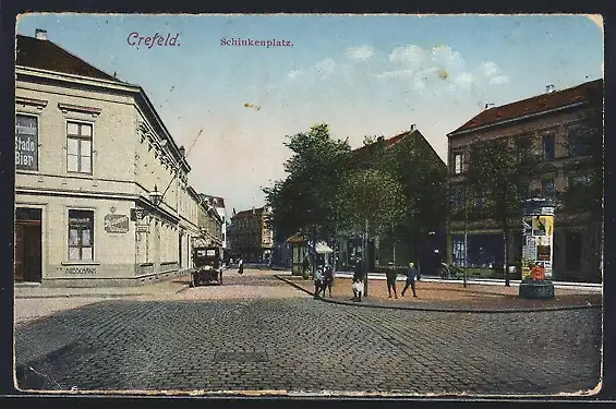 AK Crefeld, Schinkenplatz mit Gasthaus u. Litfasssäule, Panorama
