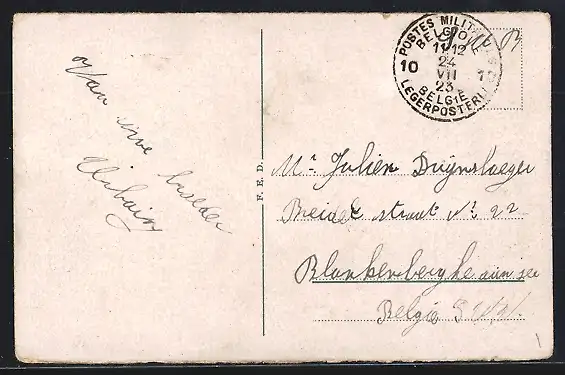 Personenbezogene Daten auf der Rückseite der Karte wurden durch blauen Textmarker unkenntlich gemacht. Die blauen Stellen sind auf die Vorderseite durchgeweicht und wirken sich negativ auf das Postkartenfoto aus