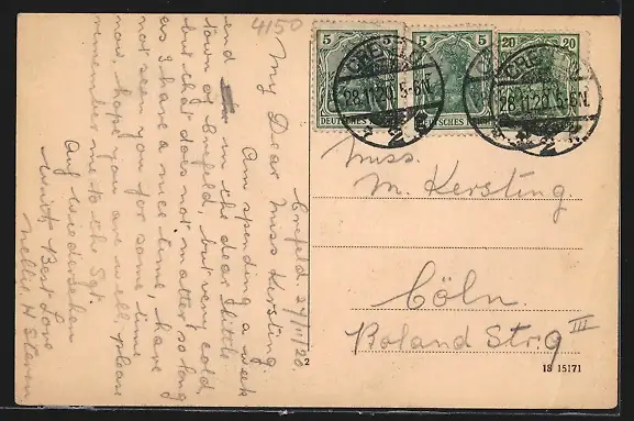 gelaufen 1920, Eckknick li. unten, guter Zustand