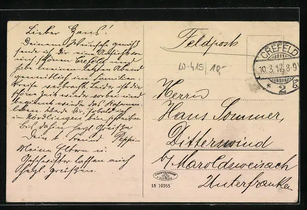 alte Ansichtskarte, gelaufen 1917, Eckknick oben re., guter Zustand