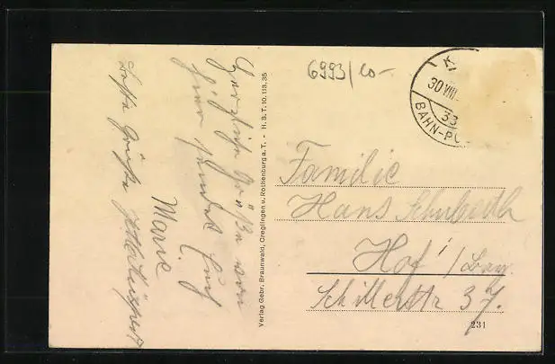 Personenbezogene Daten auf der Rückseite der Karte wurden durch blauen Textmarker unkenntlich gemacht. Die blauen Stellen sind auf die Vorderseite durchgeweicht und wirken sich negativ auf das Postkartenfoto aus