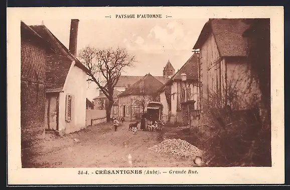 AK Crésantignes, Grande Rue en automne avec arbres et charrette