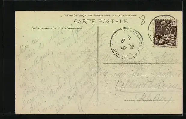 Personenbezogene Daten auf der Rückseite der Karte wurden durch blauen Textmarker unkenntlich gemacht. Die blauen Stellen sind auf die Vorderseite durchgeweicht und wirken sich negativ auf das Postkartenfoto aus