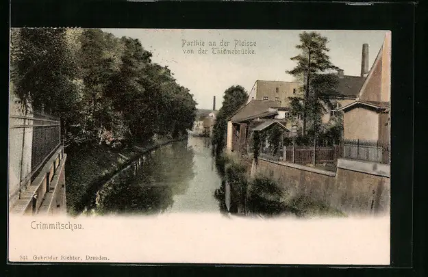 AK Crimmitschau, Partie an der Pleisse von der Thiemebrücke