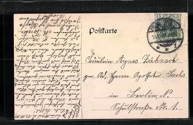 Personenbezogene Daten auf der Rückseite der Karte wurden durch blauen Textmarker unkenntlich gemacht. Die blauen Stellen sind auf die Vorderseite durchgeweicht und wirken sich negativ auf das Postkartenfoto aus