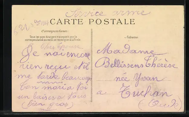 Personenbezogene Daten auf der Rückseite der Karte wurden durch blauen Textmarker unkenntlich gemacht. Die blauen Stellen sind auf die Vorderseite durchgeweicht und wirken sich negativ auf das Postkartenfoto aus