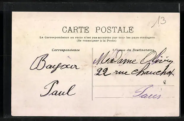 Personenbezogene Daten auf der Rückseite der Karte wurden durch blauen Textmarker unkenntlich gemacht. Die blauen Stellen sind auf die Vorderseite durchgeweicht und wirken sich negativ auf das Postkartenfoto aus