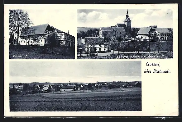 AK Crossen / Erlau, Gasthof, Schule und Kirche, Gesamtansicht
