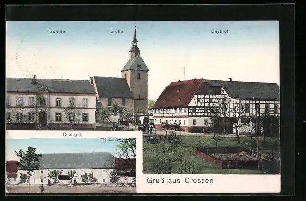 AK Crossen, Gasthof mit Kirche und Schule, Rittergut