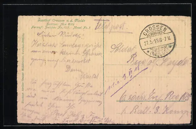 Personenbezogene Daten auf der Rückseite der Karte wurden durch blauen Textmarker unkenntlich gemacht. Die blauen Stellen sind auf die Vorderseite durchgeweicht und wirken sich negativ auf das Postkartenfoto aus