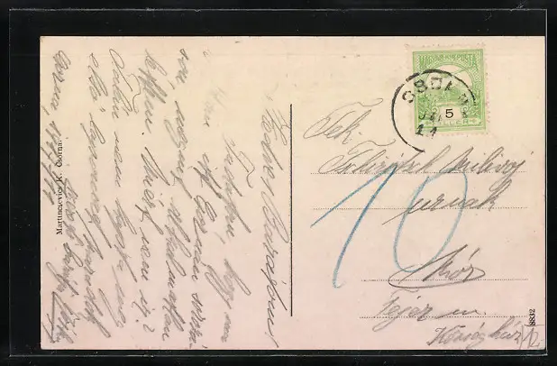 Personenbezogene Daten auf der Rückseite der Karte wurden durch blauen Textmarker unkenntlich gemacht. Die blauen Stellen sind auf die Vorderseite durchgeweicht und wirken sich negativ auf das Postkartenfoto aus