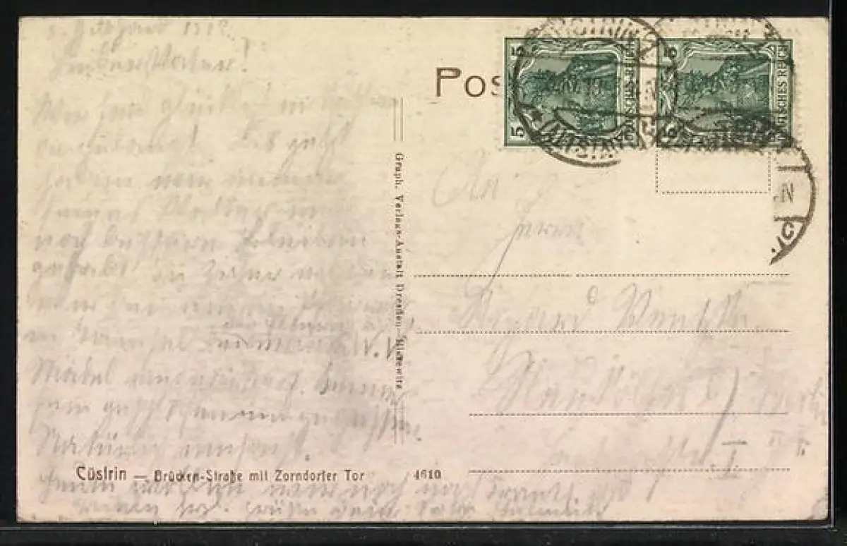 Personenbezogene Daten auf der Rückseite der Karte wurden durch blauen Textmarker unkenntlich gemacht. Die blauen Stellen sind auf die Vorderseite durchgeweicht und wirken sich negativ auf das Postkartenfoto aus