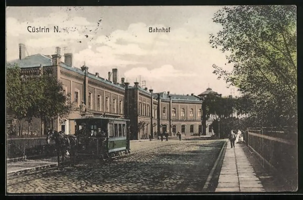 AK Cüstrin N., Bahnhof mit Pferde-Strassenbahn