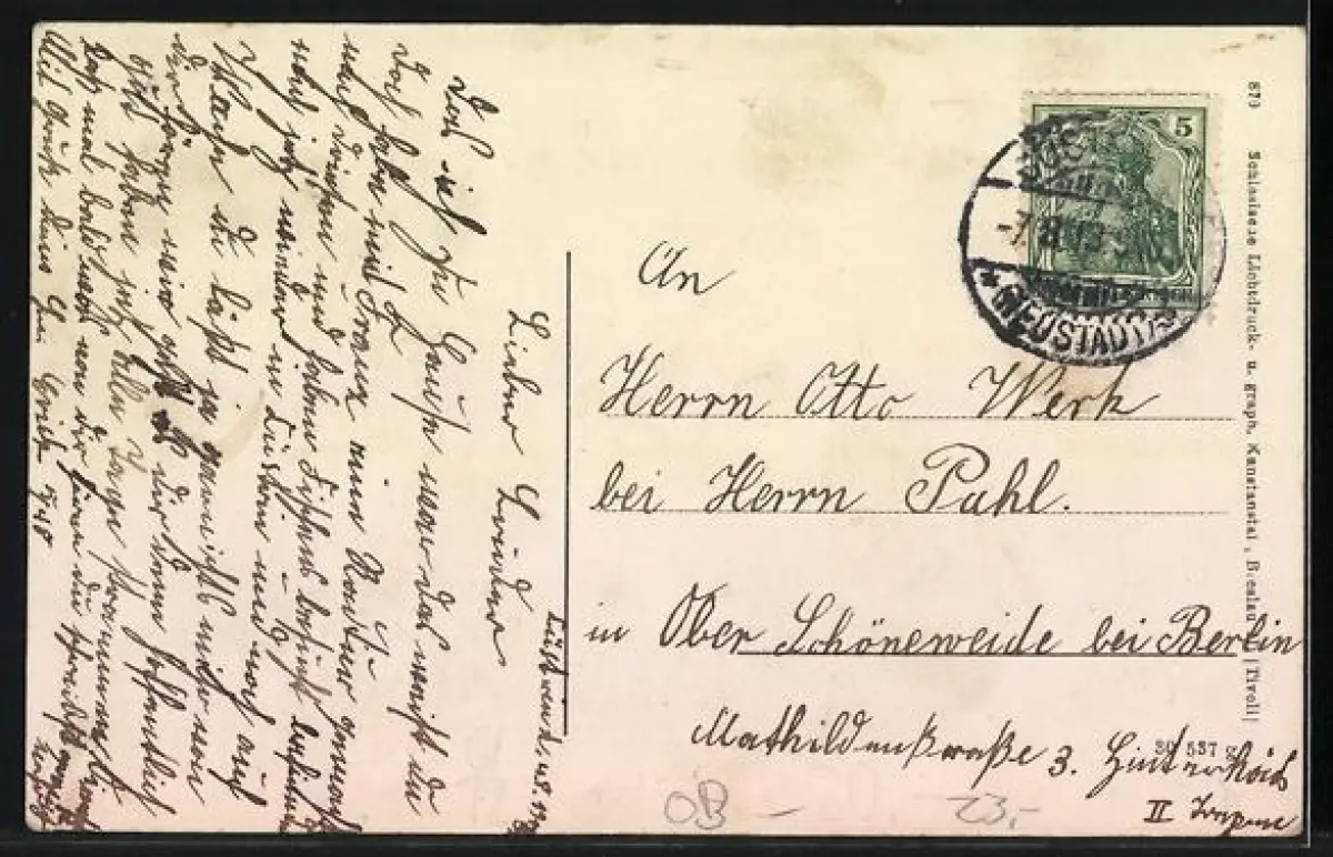 Personenbezogene Daten auf der Rückseite der Karte wurden durch blauen Textmarker unkenntlich gemacht. Die blauen Stellen sind auf die Vorderseite durchgeweicht und wirken sich negativ auf das Postkartenfoto aus