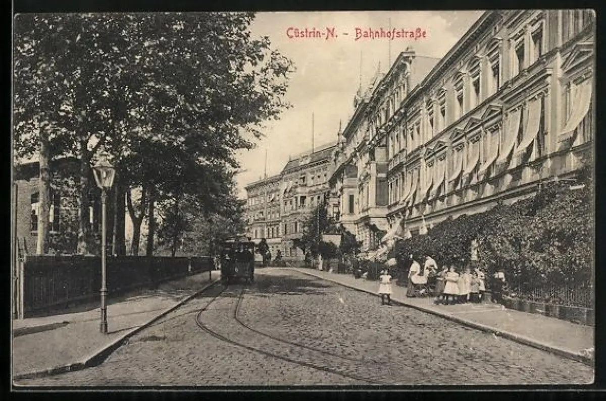 AK Cüstrin-N., Partie in der Bahnhofstrasse mit Strassenbahn