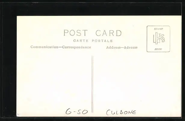 Personenbezogene Daten auf der Rückseite der Karte wurden durch blauen Textmarker unkenntlich gemacht. Die blauen Stellen sind auf die Vorderseite durchgeweicht und wirken sich negativ auf das Postkartenfoto aus