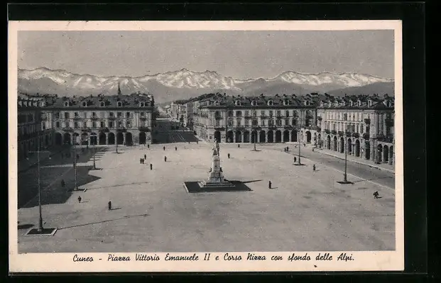 AK Cuneo, Piazza Vittorio Emanuele II e Corso Nizza con sfondo delle Alpi
