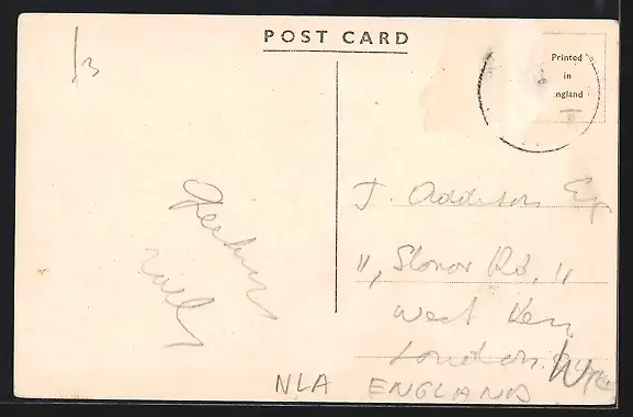 Personenbezogene Daten auf der Rückseite der Karte wurden durch blauen Textmarker unkenntlich gemacht. Die blauen Stellen sind auf die Vorderseite durchgeweicht und wirken sich negativ auf das Postkartenfoto aus