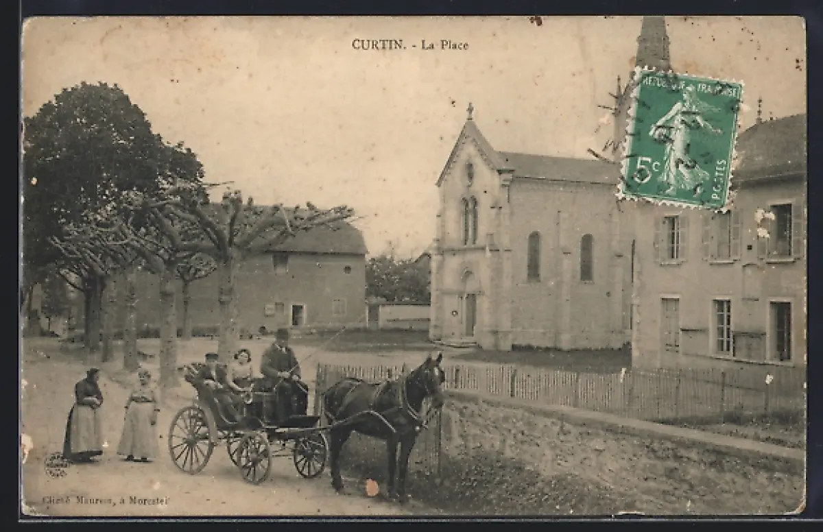 AK Curtin, La Place avec calèche et habitants devant l`église