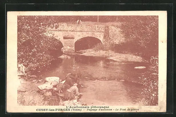 AK Cussy-les-Forges, Paysage d`Automne, le Pont de Pierre, Waschfrauen