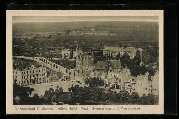 AK Cuxhaven, Blick auf Dolles Hotel, Post, Gymnasium a. d. Vogelschau