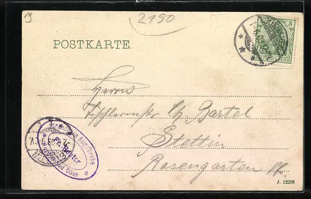 Personenbezogene Daten auf der Rückseite der Karte wurden durch blauen Textmarker unkenntlich gemacht. Die blauen Stellen sind auf die Vorderseite durchgeweicht und wirken sich negativ auf das Postkartenfoto aus