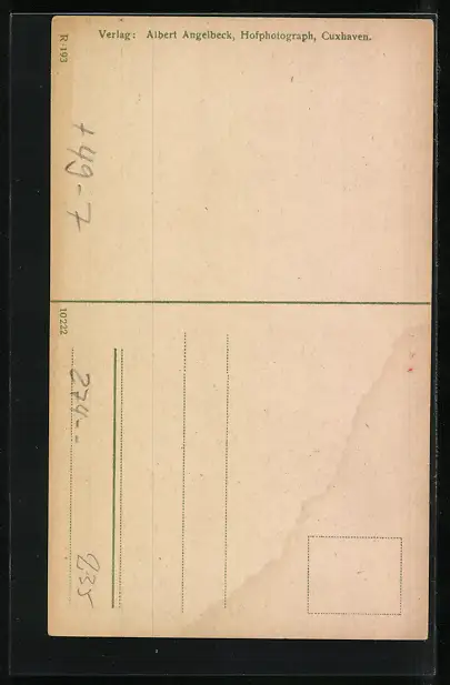 Personenbezogene Daten auf der Rückseite der Karte wurden durch blauen Textmarker unkenntlich gemacht. Die blauen Stellen sind auf die Vorderseite durchgeweicht und wirken sich negativ auf das Postkartenfoto aus
