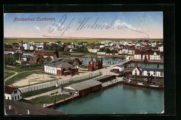 AK Cuxhaven, Ortsansicht mit Hafengelände aus der Vogelschau