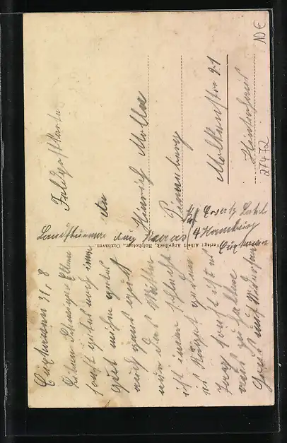 Personenbezogene Daten auf der Rückseite der Karte wurden durch blauen Textmarker unkenntlich gemacht. Die blauen Stellen sind auf die Vorderseite durchgeweicht und wirken sich negativ auf das Postkartenfoto aus