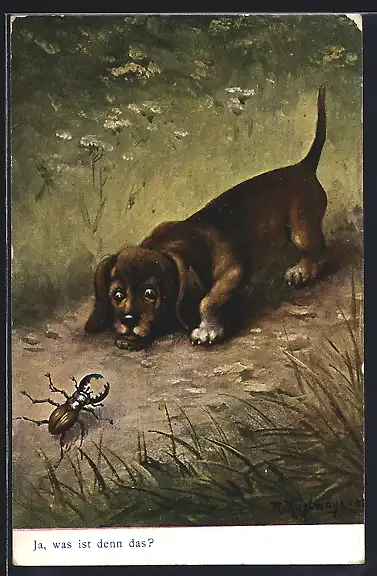 AK Dackel beschaut sich interessiert einen Hirschkäfer