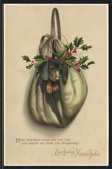 AK Dackel im Rucksack mit Stechpalmenzweig