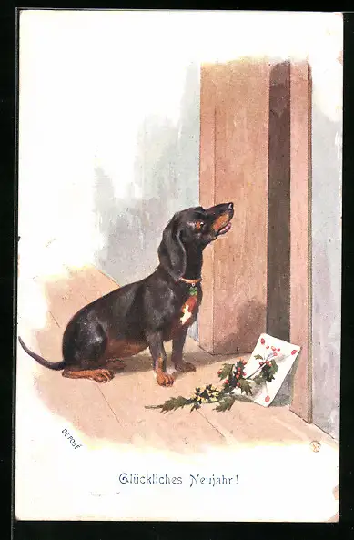 AK Dackel mit Brief und Stechpalmenzweig vor einer Tür, Neujahrsgruss