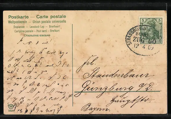 Personenbezogene Daten auf der Rückseite der Karte wurden durch blauen Textmarker unkenntlich gemacht. Die blauen Stellen sind auf die Vorderseite durchgeweicht und wirken sich negativ auf das Postkartenfoto aus