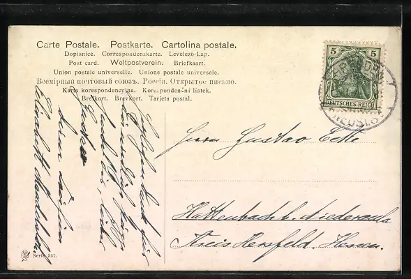 Personenbezogene Daten auf der Rückseite der Karte wurden durch blauen Textmarker unkenntlich gemacht. Die blauen Stellen sind auf die Vorderseite durchgeweicht und wirken sich negativ auf das Postkartenfoto aus