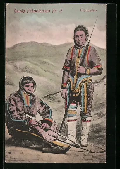 AK Dänische Nationaltrachten, Groenlaendere, Grönländisches Paar mit Jagdwaffen