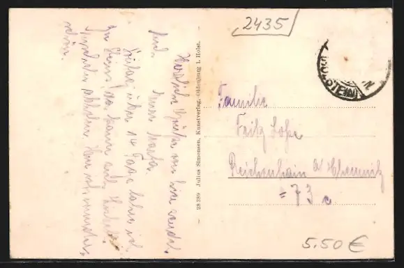 alte Ansichtskarte, gelaufen, Briefmarke entfernt, rückseitig Oberflächenschaden, guter Zustand