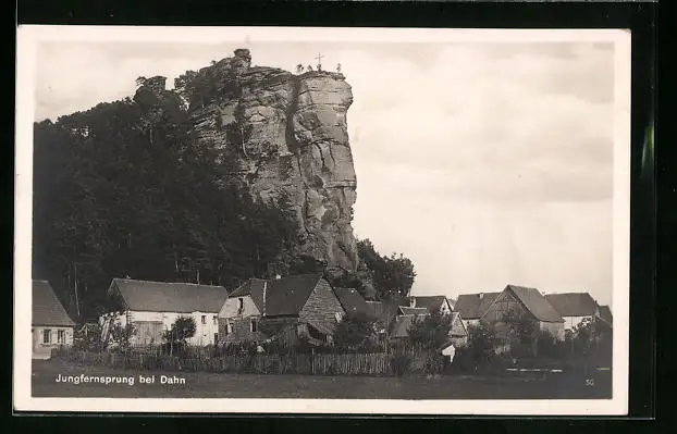 AK Dahn, Holzhäuser vor dem Jungfernsprung