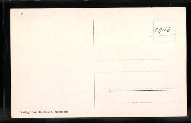 Personenbezogene Daten auf der Rückseite der Karte wurden durch blauen Textmarker unkenntlich gemacht. Die blauen Stellen sind auf die Vorderseite durchgeweicht und wirken sich negativ auf das Postkartenfoto aus