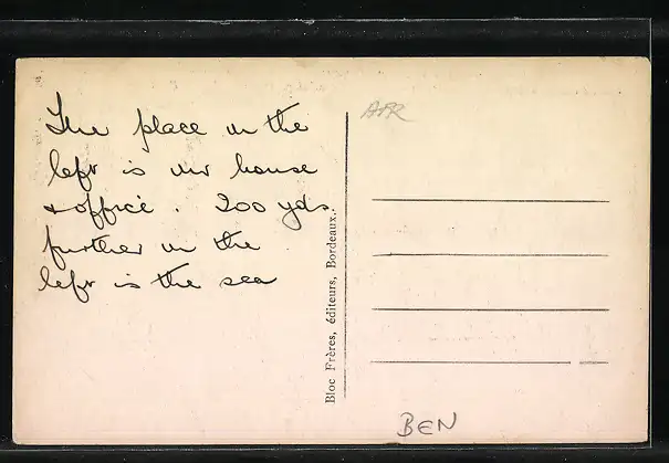 Personenbezogene Daten auf der Rückseite der Karte wurden durch blauen Textmarker unkenntlich gemacht. Die blauen Stellen sind auf die Vorderseite durchgeweicht und wirken sich negativ auf das Postkartenfoto aus