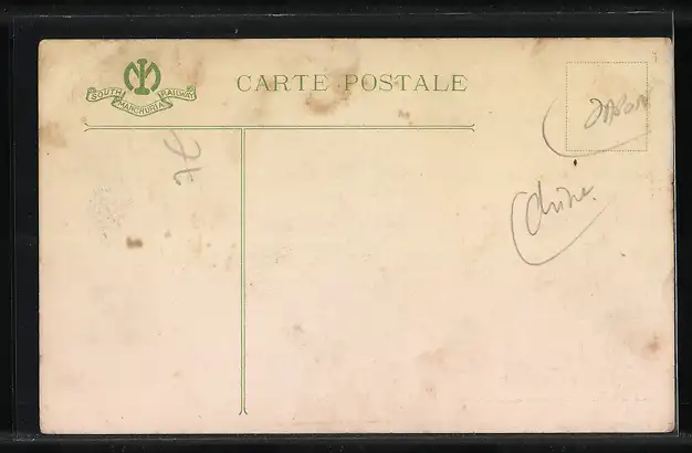 Personenbezogene Daten auf der Rückseite der Karte wurden durch blauen Textmarker unkenntlich gemacht. Die blauen Stellen sind auf die Vorderseite durchgeweicht und wirken sich negativ auf das Postkartenfoto aus