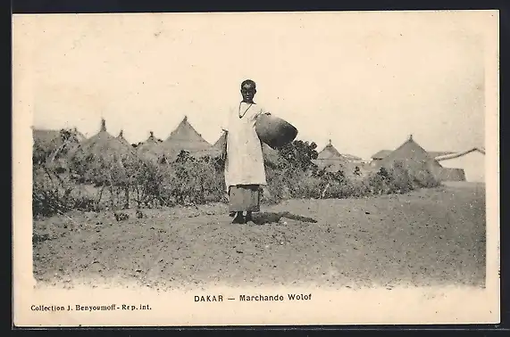 AK Dakar, Marchande Wolof, afrikanische Frau steht vor einem Dorf