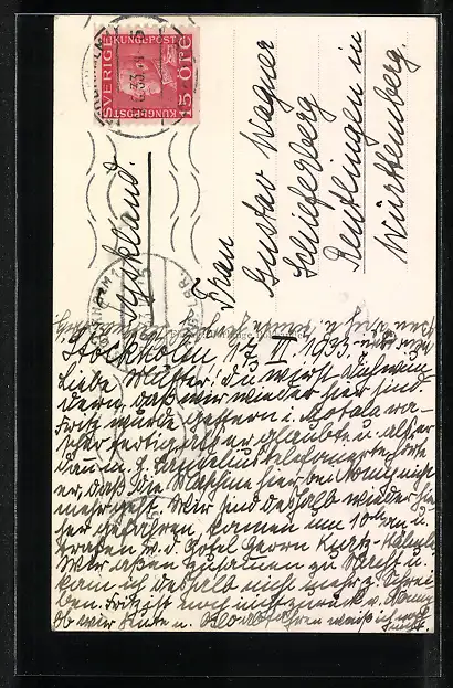 Personenbezogene Daten auf der Rückseite der Karte wurden durch blauen Textmarker unkenntlich gemacht. Die blauen Stellen sind auf die Vorderseite durchgeweicht und wirken sich negativ auf das Postkartenfoto aus