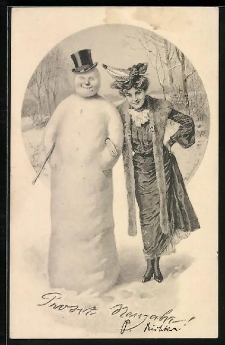 AK Dame Arm in Arm mit einem Schneemann, Prosit Neujahr